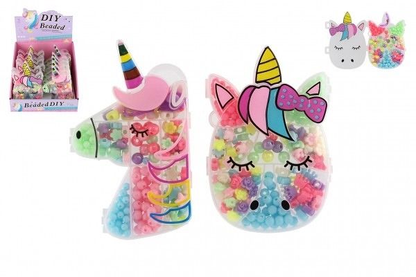 Každá malá princezna si zamiluje tuto sadu! Krabička z průhledného plastu ve tvaru jednorožce, má devět přihrádek, které obsahují různé druhy korálků a šňůrku na navléknutí.
