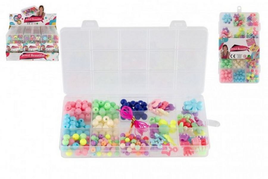 Korálky plastové barevné se šňůrkou v plastové krabičce 10x17x2cm