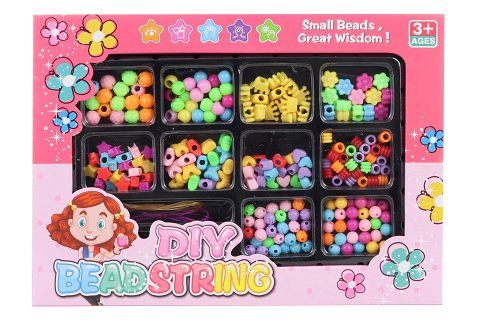 Sada korálků na navlékání. V balení je mnoho barev a druhů korálků a šňůrky na navlékání. Rozměr balení cca 26 x 18,5 x 2,5 cm. Věk 3+