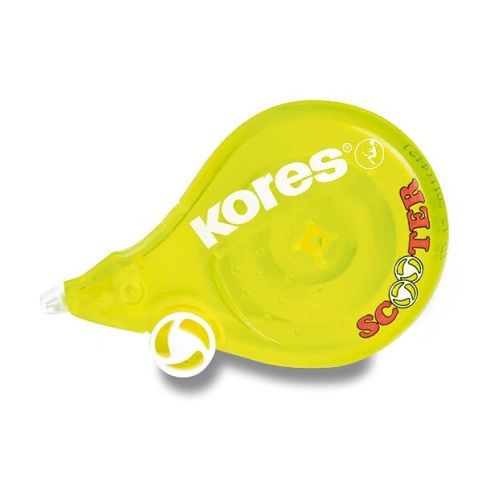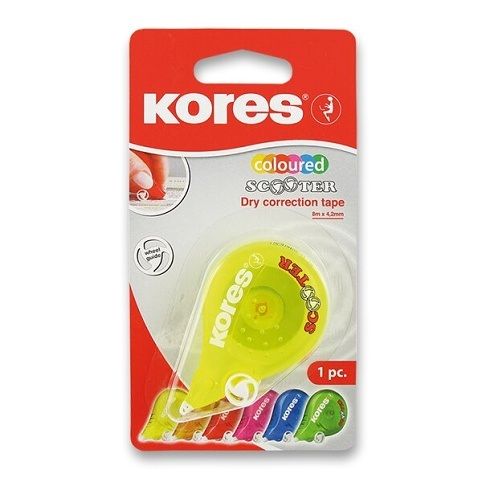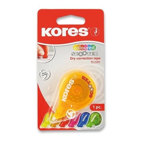 Jednorázový korekční strojekKores Scooter s opravnou páskou 4,2 mm x 8 m. Vhodný pro všechny druhy korektur. Spomocnými kolečky "Wheelguide" pro přesnou a rychlou opravu. Možnost okamžitého přepsání. Mix barev.
