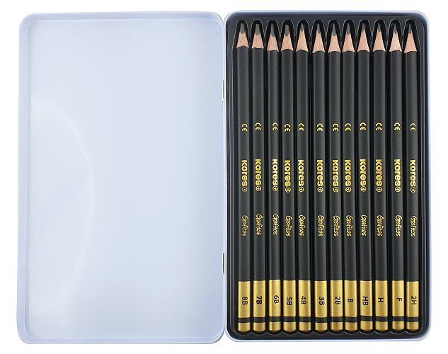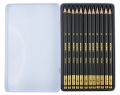 Sada 12 ks grafitových tužek různých tvrdostí (8B,7B,6B,5B,4B,3B,2B,B,HB,F,H,2H). Ergonomický trojhranný tvar. V elegantním designu matné černé. Ve vysoce kvalitním kovovém pouzdře. Lakovaný konec. Vysoce kvalitní dřevo pro snadné ořezávání. Silná a odolná tuha. Jemné a pohodlné psaní, neškrábe. Ideální pro použití doma, v kanceláři a ve škole.
