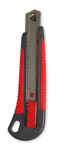 Robustní odlamovací nůž s čepelí pro řemesla, kancelář a hobby. Protismyková měkká rukojeť pro bezpečnou a pohodlnou manipulaci. Sundavací klip s drážkou na zalomení čepele. Systém automatického blokování nožů. Kovová kolejnice pro bezpečnou a přenou práci. Může být použit na papír, karton, polystyren, plátno, kůže, lano apod. Praktické odolné pouzdro. V červeno-šedé barvě.