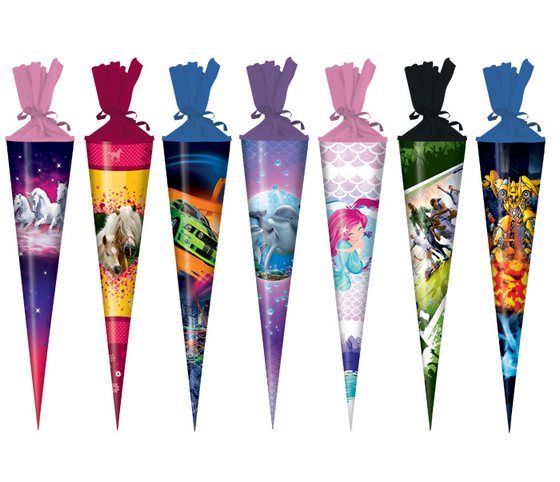 Školní papírový kornout na sladkosti- barevný potiskem dětských motivů - tylový lem- do kornoutu se vejde spousta cukrovinek a sladkostí- atraktivní doplněk pro prvňáčky v jejich první školní den - délka: 70cm- průměr: 16cm- mix motivů