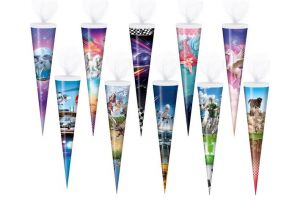 Školní papírový kornout na sladkosti- barevný potiskem dětských motivů - tylový lem- do kornoutu se vejde spousta cukrovinek a sladkostí- atraktivní doplněk pro prvňáčky v jejich první školní den - délka: 70cm- průměr: 16cm- mix motivů