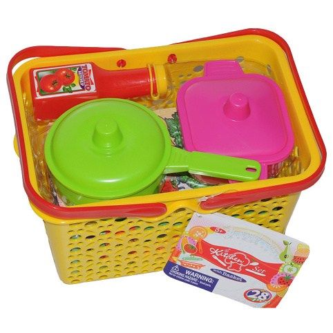 Nákupní košík z plastu, který obsahuje 28 kusů kuchyňských