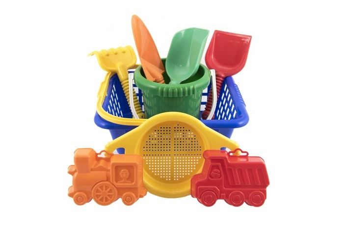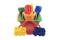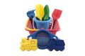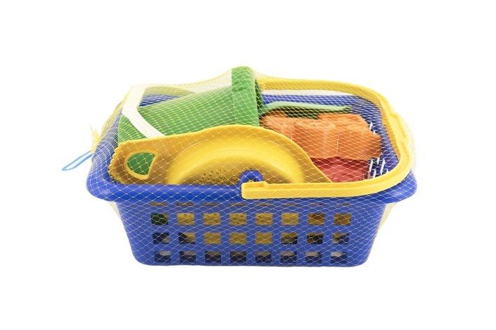 Sada na písek. Sada obsahuje košík, kyblík, 2 bábovky, rýč, lopatku a sítko.