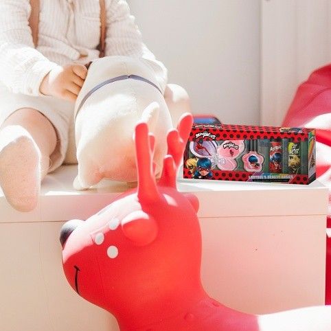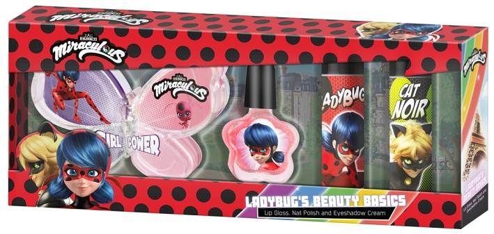 Kosmetická kazeta Kouzelná beruška – obsahuje 4× krémové oční stíny v kazetě ve tvaru motýlka, 2× balzámy na rty a lak na nehty ve sklaničce ve tvaru kytičky.