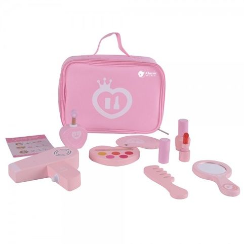 S touto dřevěnou make-up sadou máte vždy vše po ruce, abyste byla krásná. Věci snadno přenesete ve veselé růžové taštičce. Kosmetická taštička s doplňky pro líčení je ideální hračkou pro malou princeznu. Tato sada pomáhá podporovat rozvoj dětské představivosti a také rozvíjí jemnou motoriku.