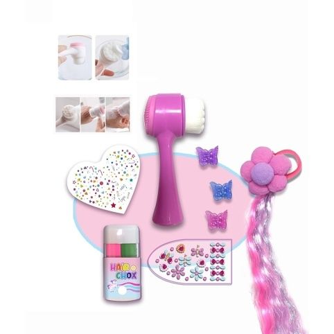 Kosmetická sada s doplňky pro vlasy zaabcí každou slečnu. V balení najdete barevné vlasové křídy, gumičku s barevnými vlasovými prameny, malé skřipce ve tvaru motýlků, ozdobné kamínky, čistící kartáček na pleť a nálepky. Vhodné pro děti do 6ti let.