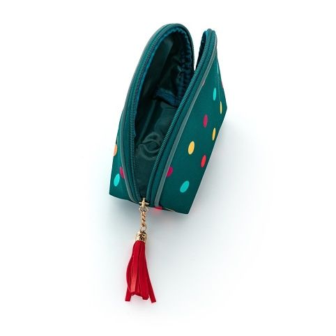 Cestovní kulatá kosmetická taška v puntíkovém provedení. Vhodná k uskladnění toaletních a kosmetických potřeb menší velikosti.