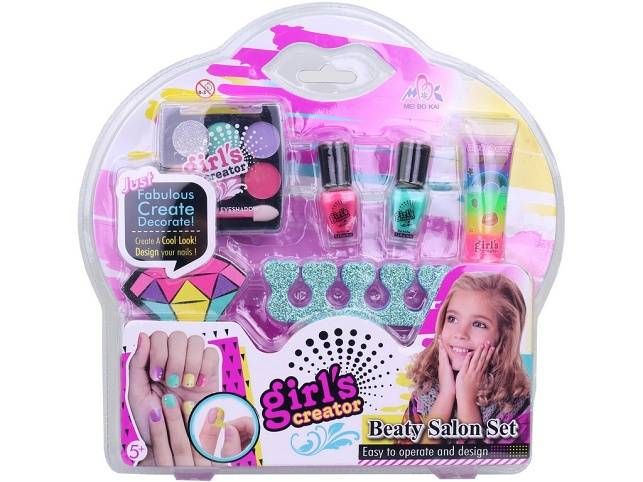 Kosmetická sada s nehtovým studiem. Sada obsahuje 2 laky na nehty, nálepky na nehty, podpěru prstů, soupravu k malování tváře, lesk na rty. Velikost balení 29 x 26,5 x 3,4 cm. Vhodné pro děti od 5 let.