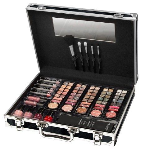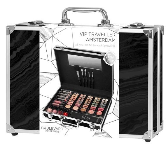 Kosmetický kufřík hliníkový Traveller Amsterdam černý s integrovaným zrcátkem. Obsahuje celkem 81 ks – 4× lak na vlasy, 2× lesk na rty, 5× aplikátory a štětce, 1× cestovní taštička, 5× vyměnitelná paleta – jedna paleta obsahuje 10× oční stíny, 2× lesk na rty a 1× tvářenku. Dermatologicky testováno, vyhovuje přísným normám EU. Zdravotně nezávadné.