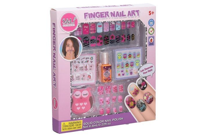 Kosmetický set péče o nehty. Obsahuje nalepovací nehty, lak na nehty, pilník, nálepky na nehty, lak na nehty.