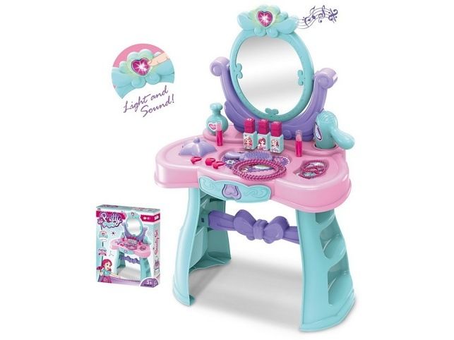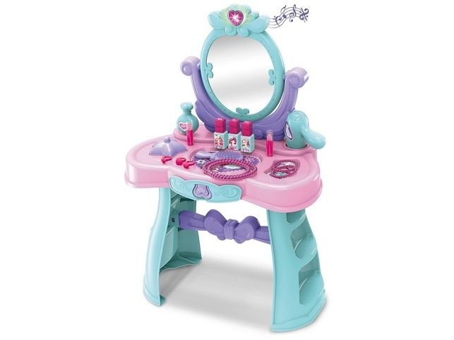 Luxusní kosmetický pultík by neměl chybět žádné malé parádnici. Pultík je v krásně sladěných barvách. Nechybí k němu doplňky jako hřeben, laky, korálky, rtěnky. Do pultíku je vloženo zrcadlo, které po stisknutí srdce hraje. Napájení: baterie 3 x 1,5V(AAA)Materiál: plastDoporučený věk: 3+