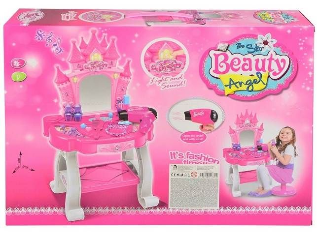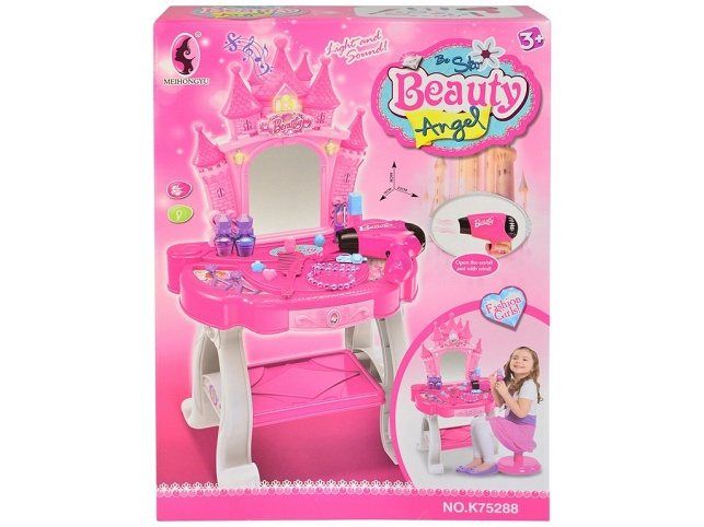 Každá holčička touží být princeznou a s touto sadou se jí přání může snadno splnit. Luxusní stolek má zrcadlo bohatě zdobené se zajímavými tvary a mnoho pěkného příslušenství. V horní části zrcadla je tlačítko pro spuštní příjemné melodie. Stolička není součástí. Rozměr: 64 x 35 x 23 cmNapájení: 3 x 1,5V (AA) baterie nejsou součástí balení.