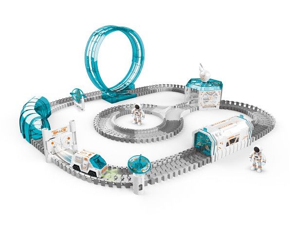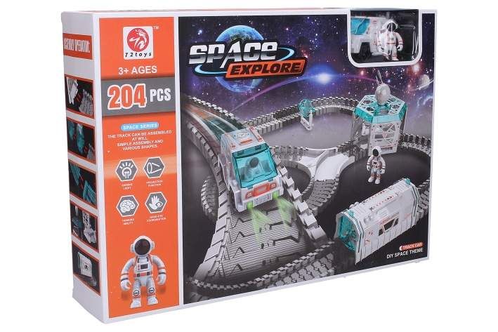 Kosmická dráha velká. Rozměry 85x75x32 cm. Součástí auto, kosmonaut, funkční projektor. Světelné efekty. 2xAAA baterie do auta nejsou součástí, 3xAG13 do projektoru součástí. Přepínač ON/OFF na spodní straně auta a na projektoru. Obrázkový návod na sestavení na obalu. Dráhu lze sestavit do různých tvarů dle obrázků na obalu.
