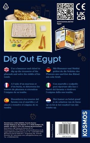 KOSMOS Egyptské vykopávky. Doporučený věk 7-11 let. Obsahuje majzlík a kladívko na odkrytí vykopávek v sádře. Český návod ke stáhnutí v digitální podobě-QR kód na krabici a v návodu.
