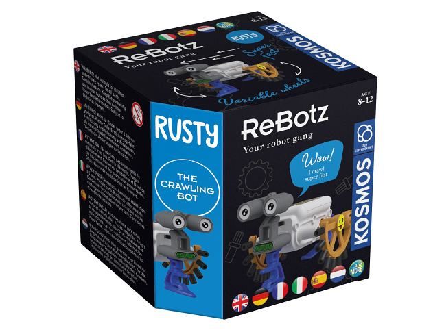 KOSMOS Robot Rusty jezdící. 3xAAA baterie nejsou součástí. Obsahuje dílky ke složení robota, nálepky. Doporučený věk 8-12 let. Český návod ke stáhnutí v digitální podobě-QR kód na krabici a v návodu.