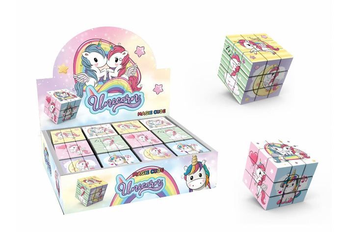 Kostka obrázkový hlavolam jednorožec. Přesné rozměry 5,7x5. 7x5. 7 cm. Display box 12 ks.