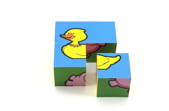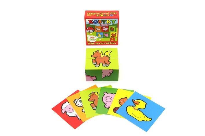 Dřevěné kostky s barevnými obrázky domácích zvířátek jsou výborná volba pro nejmenší. Při jejich správném poskládání se zobrazí jeden z obrázků, hra tím napomáhá rozvíjet u dětí logické uvažování, fantazii a jemnou motoriku.