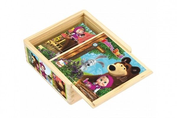 Kostky kubus dřevěné Máša a Medvěd 9ks v krabičce 13x13x5cm 12m+