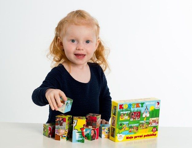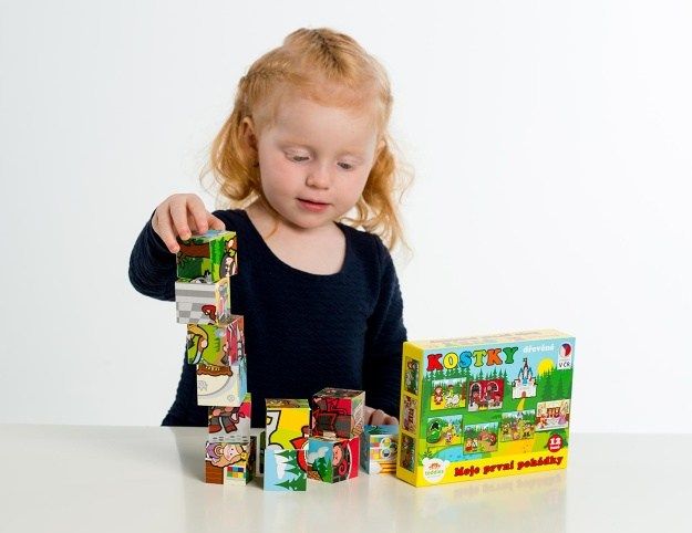 Dřevěné kostky s barevnými obrázky na motivy klasických pohádek jsou výbornou volbou pro nejmenší.