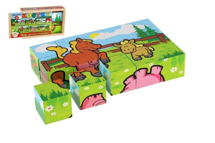 Kostky jsou uloženy v dřevěné krabičce a lze z nich sestavit 6 různých obrázků se zvířátky. A když děti přestane bavit skládání obrázků, mohou si postavit třeba vysokou věž.