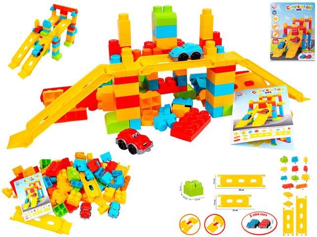 Kostky stavební 90ks s dráhou a auty 2ks v krabičce