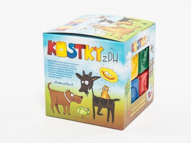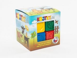 Čtyři různé druhy plastových kostek pro děti, které rozvijí motoriku dětí. Hrací plastové kostky