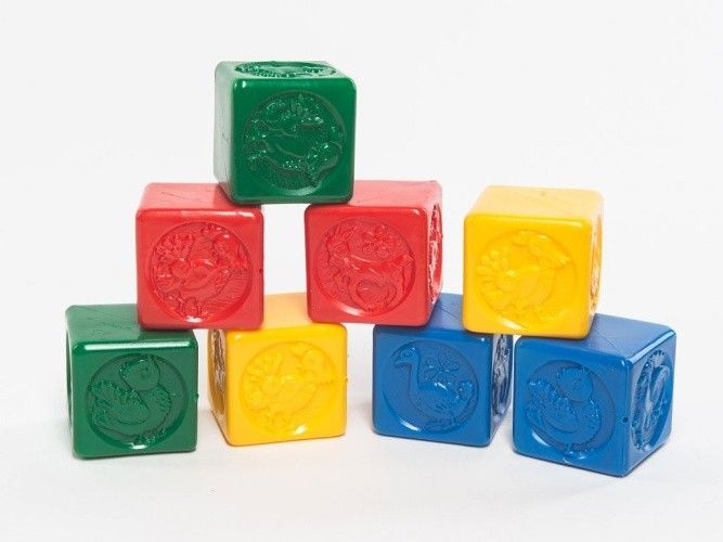 Sada osmi kusů barevných kostek pro nejmenší děti z plastu.