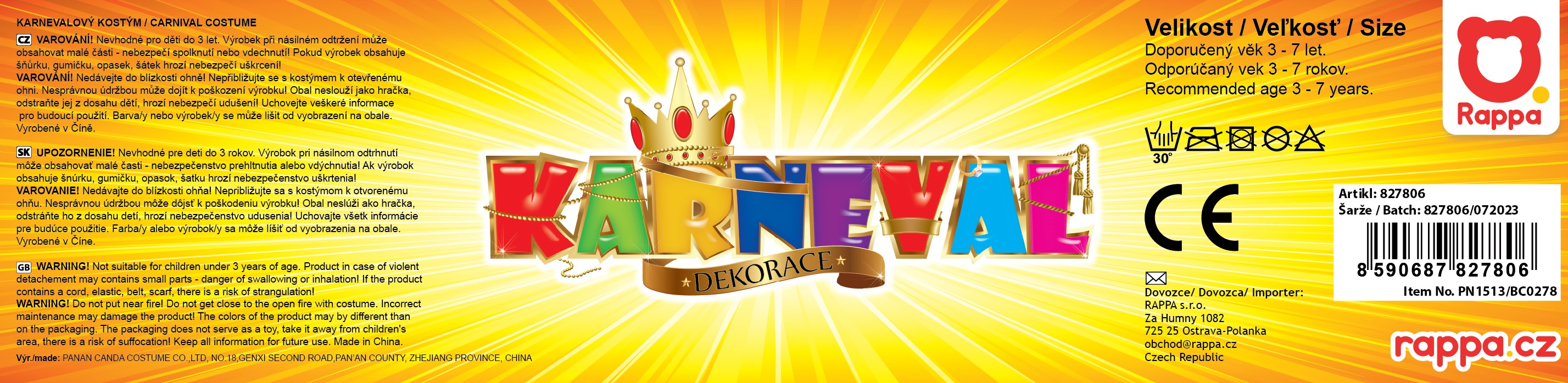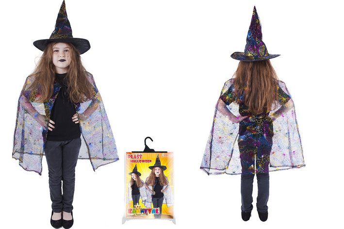 Každá správná čarodějnice potřebuje plášť a klobouk. Ať už se vaše dítě chystá na karneval, halloweenský večírek nebo na pálení čarodějnic, s touto krásnou sadou vždycky zazáří. Čarodějnický plášť i klobouk jsou sladěny a ozdobeny metalickými, magickými motivy ve veselých barvách. Kostým je doporučen pro děti v rozmezí 3-10 let (104-150 cm).
