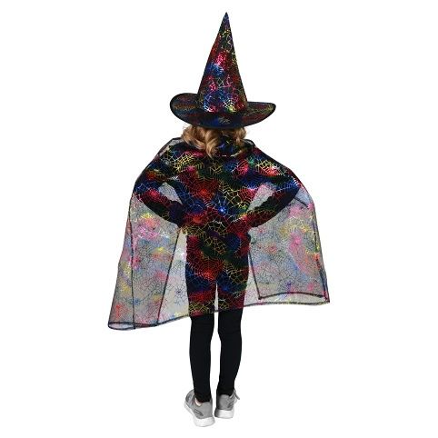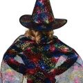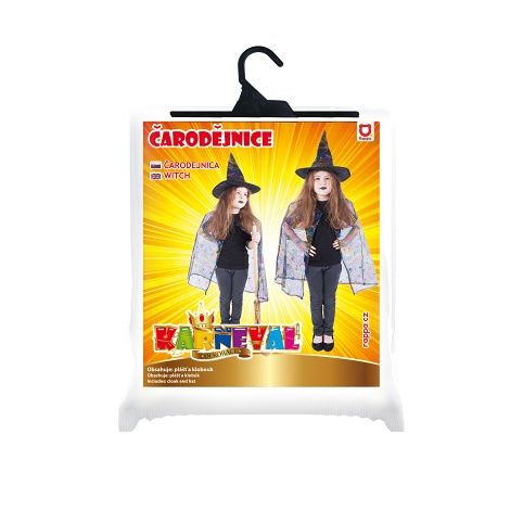 Krásná sada na čarodějnice nebo halloweenský večírek! Komplet obsahuje plášť a perfektně sladěný klobouk. Vše je dekorováno metalickými, magickými motivy různých barev. Doporučeno pro děti ve věkovém rozmezí 3-7 let.