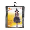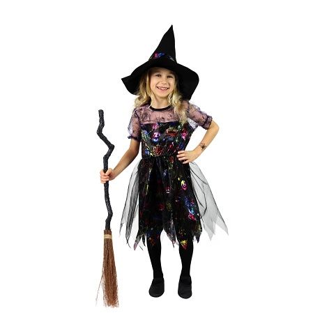 Karnevalový kostým pro malé čarodějnice! Kostým černo-fialové barvy ve velikosti S je určen pro holčičky ve věkovém rozmezí 4-6 let. Šaty jsou dekorovány barevnými halloweenskými motivy. Součástí kostýmu je perfektně sladěný čarodějnický klobouk. S tímto úchvatným kostýmem se zaručeně staneš hvězdou karnevalu i Halloweenu!