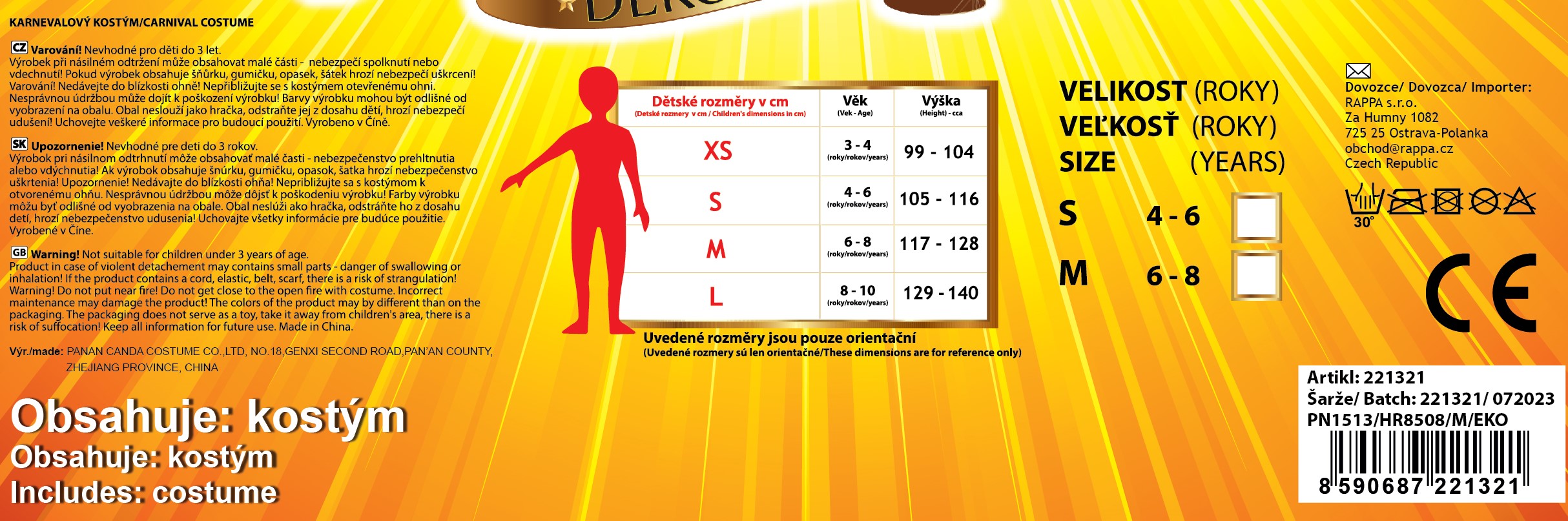 Roztomilý karnevalový kostým s motivem čarodějky udělá radost každé holčičce! Souprava obsahuje pouze šaty, koště není součástí balení. Set ve velikosti M je určen pro holčičky ve věkovém rozmezí 6-8 let. Staň se nejhezčí čarodějnicí karnevalu díky tomuto kostýmu! Vhodný i na oslavu Halloweenu. Nejen letos je potřeba myslet EKO-nomicky i EKO-logicky! EKO-balení je vhodné zejména pro e-shopy kde zákazník nakupuje dle fotografie a není třeba velkého balení s věšákem. EKO-logicky – na balení bylo použito méně plastu a dalších materiálů. Jedná se o malý transparentní obal s fotografií. EKO-nomicky –EKO-obal zabere jen polovinu místa – šetřete skladová místa s námi!