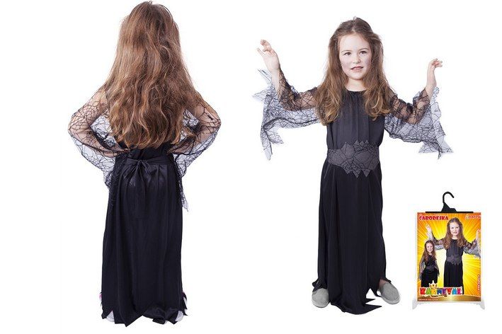 Kostým pro malé čarodějnice! Kostým černé barvy ve velikosti M je určen pro holčičky ve věkovém rozmezí 4-6 let (110-116 cm). Šaty jsou dekorovány průhlednými rukávy s motivem pavučin. S tímto úchvatným kostýmem se zaručeně staneš hvězdou karnevalu!