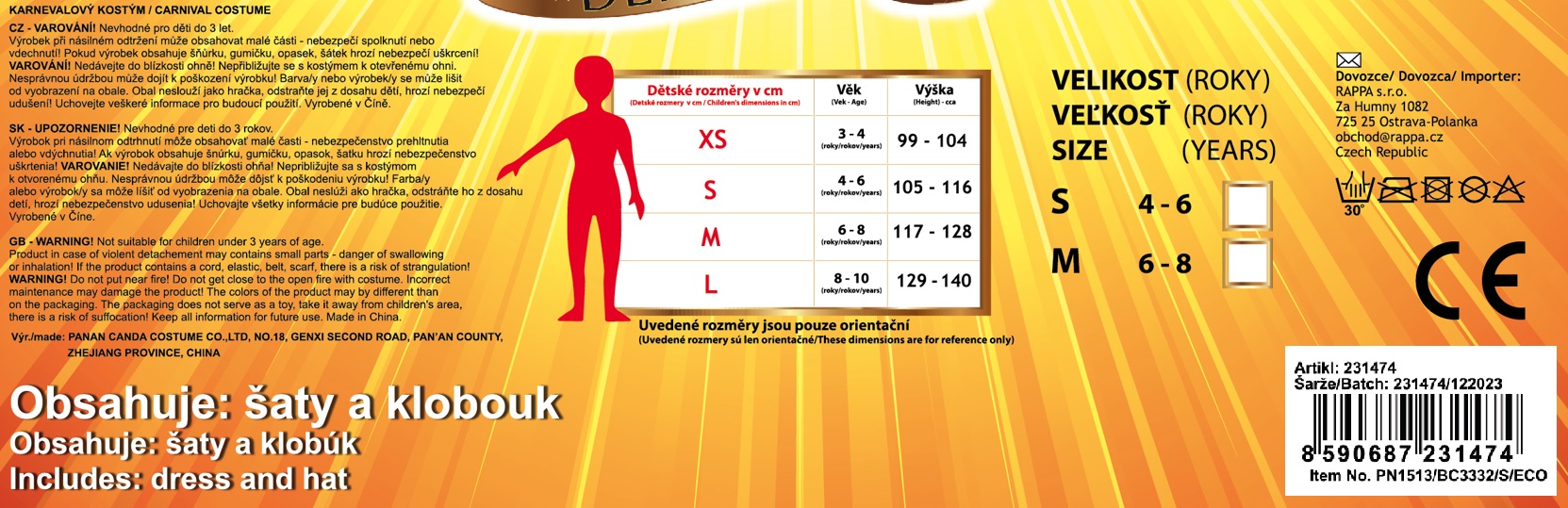 Parádní karnevalový kostým s motivem čarodějnice! Kostým fialovo-černé barvy ve velikosti S je určen pro holčičky ve věkovém rozmezí 3-6 let (105-116 cm). Šaty jsou zdobené potiskem stříbrných hvězdiček. Součástí balení je perfektně sladěný klobouk. Staň se hvězdou karnevalového nebo Halloweenského večírku! Nejen letos je potřeba myslet EKO-nomicky i EKO-logicky! EKO-balení je vhodné zejména pro e-shopy kde zákazník nakupuje dle fotografie a není třeba velkého balení s věšákem. EKO-logicky – na balení bylo použito méně plastu a dalších materiálů. Jedná se o malý transparentní obal s fotografií. EKO-nomicky –EKO-obal zabere jen polovinu místa – šetřete skladová místa s námi!