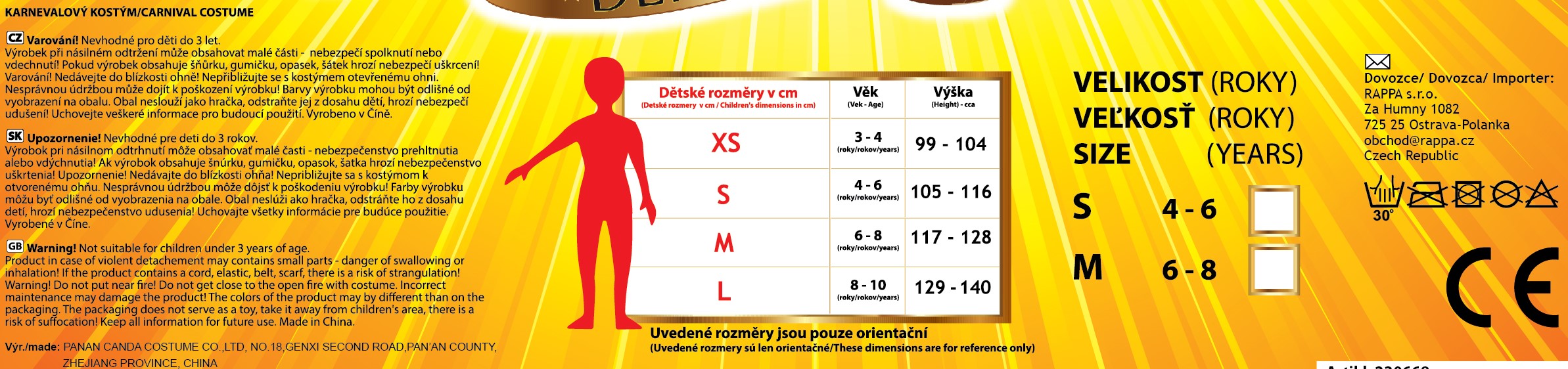 Nádherný kostým na Halloween pro všechny malé čarodějnice! Kostým fialovo-černé barvy ve velikosti S je určen pro holčičky ve věkovém rozmezí 3-6 let (105-116 cm). Šaty jsou dekorovány zlatým potiskem. Součástí kostýmu je perfektně sladěný čarodějnický klobouk. S tímto úchvatným kostýmem se zaručeně staneš hvězdou karnevalu i Halloweenu! Nejen letos je potřeba myslet EKO-nomicky i EKO-logicky! EKO-balení je vhodné zejména pro e-shopy kde zákazník nakupuje dle fotografie a není třeba velkého balení s věšákem. EKO-logicky – na balení bylo použito méně plastu a dalších materiálů. Jedná se o malý transparentní obal s fotografií. EKO-nomicky –EKO-obal zabere jen polovinu místa – šetřete skladová místa s námi!