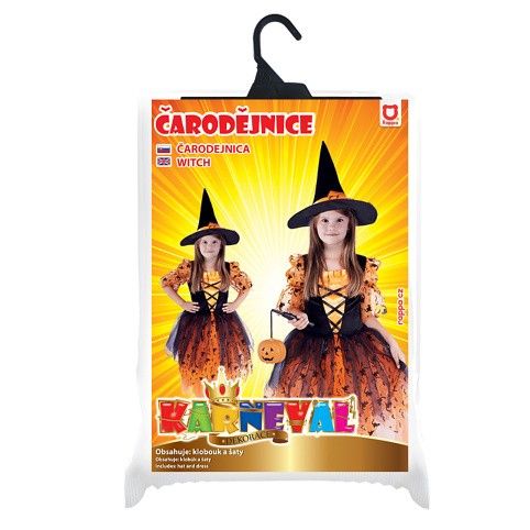 Parádní karnevalový kostým s motivem čarodějnice v oranžovo-černé barvě a velikosti M je určen pro holčičky ve věkovém rozmezí 6-8 let (116-128 cm). Balení obsahuje klobouk a šaty. Staň se hvězdou karnevalového večírku díky tomuto kostýmu!