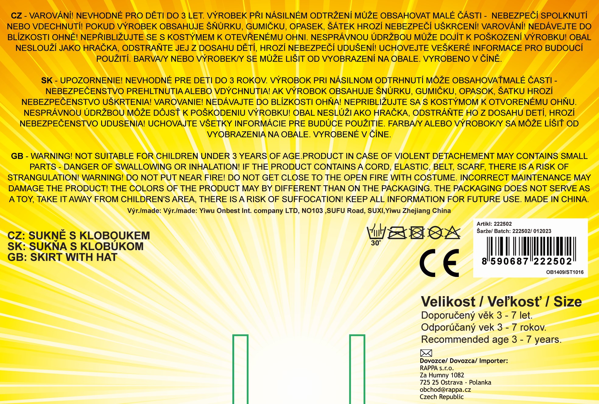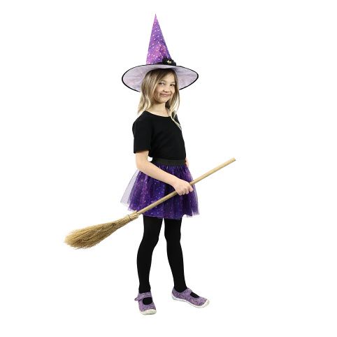 Magický kostýmek fialové barvy zdobený dekorem hvězdiček je určen pro holčičky ve věkovém rozmezí 3-7 let. Balení obsahuje nadýchanou sukničku a k tomu perfektně sladěný klobouk. Sukně je v pase na gumičku. Vhodné i na halloween.