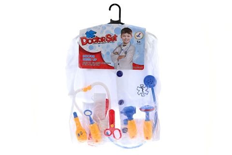Kostým doktorka. Balení obshauje plášť, roušku a soustu pomůcek nezbytných pro malou doktorku. Rozměry pláště cca 40x54 cm, délka rukávu od ramene cca 42 cm. Materiál polyester+plast. Baleno v sáčku. Rozměry balení cca 36x51x4 cm. Věk 3+