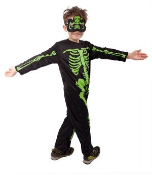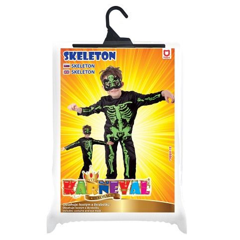 Strašidelný karnevalový kostým s motivem kostlivce! Kostým ve velikosti S je určen pro chlapečky ve věkovém rozmezí 4-6 let. Balení obsahuje černou kombinézu a masku s motivem zeleného kostlivce.