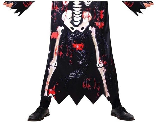Klučičí kostým Kostlivec s maskou v velikosti 110/120 cm představuje kompletní set pro dětské karnevalové a tematické párty. Kostým je tvořen dlouhým černým pláštěm s roztrhanými okraji, který je potištěn výrazným motivem kostry v bílé barvě doplněné o červené skvrny a detaily, připomínající krev a pavoučí sítě. Tento design dodává kostýmu strašidelný a autentický vzhled, který jistě zaujme každého malého fanouška hororových postav. Součástí kostýmu je také výrazná maska s kapucí, která zakrývá celou hlavu a zobrazuje lebku s velkými oranžovými očima a černými detaily. Maska má průhledný otvor pro oči, což umožňuje pohodlné nošení a dostatečný výhled. Kapuce je pevně připevněná k plášti, takže kostým drží pohromadě a je jednoduché ho obléct i svléct. Materiál kostýmu je lehký a pružný, což zajišťuje pohodlné nošení i během aktivních her. Rukávy jsou zakončeny do špičatých cípů, které doplňují celkový strašidelný vzhled. Kostým je vhodný pro děti ve věku odpovídajícím velikosti 110/120 cm, což odpovídá přibližně věku 4 až 6 let. Tento kostým je ideální volbou pro karnevaly, halloweenské oslavy nebo jiné příležitosti, kde je potřeba originální a výrazný převlek.