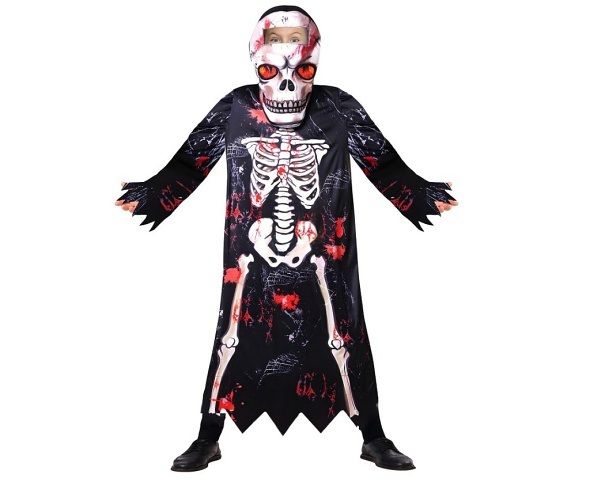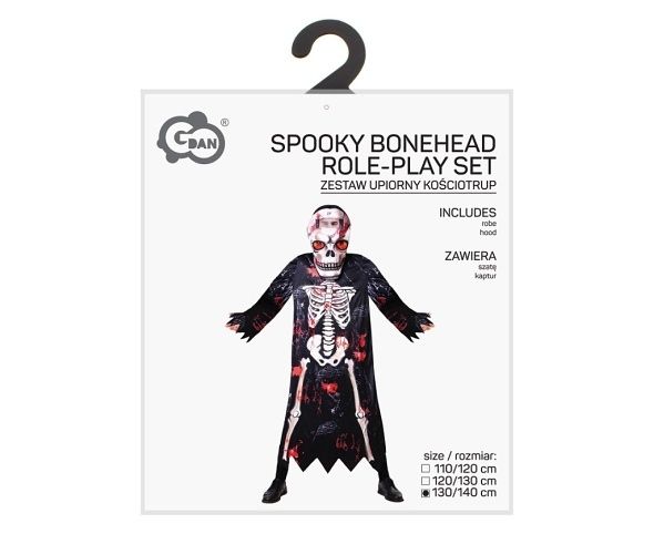 Kostým Kostlivec s maskou pro kluky ve velikosti 130/140 cm je určený pro karnevalové a tematické párty. Tento dětský kostým zahrnuje dlouhou kápi s kapucí a propracovanou masku, která zakrývá celý obličej s průzorem pro oči. Kostým je navržen tak, aby věrně připomínal kostlivce s výraznými kosterními motivy na černém podkladu, doplněné o krvavé skvrny a pavučiny, které dodávají kostýmu strašidelný vzhled. Materiál kostýmu je lehký a pružný, což umožňuje pohodlné nošení a snadnou manipulaci během hry či tance. Kápi má na koncích rukávů a spodním okraji kostýmu tvarované zubaté lemy, které zvýrazňují strašidelný efekt. Maska je pevná a dobře drží na hlavě, což zajišťuje stabilitu při nošení a zároveň umožňuje dítěti pohodlný výhled skrze průzor. Celý kostým působí vizuálně atraktivně, s jasně vytištěnými kosterními strukturami a červenými detaily, které zvyšují efekt hrůzy. Je vhodný pro děti, které chtějí na karnevalu nebo Halloween zaujmout originálním a výrazným převlekem. Kostým je součástí širší nabídky karnevalových doplňků a je zařazen v kategorii „Vše na vaší párty a karneval“.