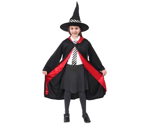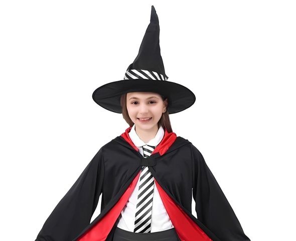 Kostým Kouzelník/Kouzelnice ve velikosti 110/120 cm je navržený pro děti, které si chtějí užít karneval nebo tematickou párty s kouzelnickou tématikou. Tento dětský kostým obsahuje dva hlavní prvky – klasický kouzelnický klobouk a výrazný plášť. Klobouk je vysoký a špičatý, celý černý s dekorativním pruhovaným páskem v černobílé kombinaci, který mu dodává charakteristický magický vzhled. Plášť je zhotoven z lehkého černého materiálu s lesklou červenou podšívkou, která je viditelná po rozepnutí a dodává kostýmu elegantní kontrast. Plášť je dostatečně dlouhý, sahá pod kolena, a jeho volný střih umožňuje pohodlné nošení a snadný pohyb během hraní či tancování. Zapínání je řešeno jednoduchým páskem či stuhou kolem krku, což usnadňuje oblékání i svlékání. Celkový dojem kostýmu je podpořen univerzálním designem, který může být využit jak pro chlapeckou, tak dívčí verzi kouzelníka či kouzelnice. Kostým je vhodný pro děti ve věku odpovídajícím velikosti 110/120 cm. Díky svému zpracování a barevnému kontrastu černé a červené barvy je ideální volbou pro tematické oslavy, karnevaly nebo divadelní představení, kde děti mohou rozvíjet svou představivost a hravou formou vstoupit do světa magie.