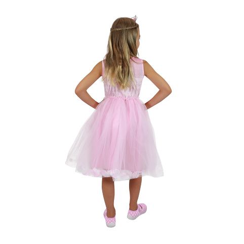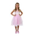 Okouzlující dívčí kostým pro princezny! Kostýmek růžové barvy je kombinován ve spodní části saténovou spodničkou, kterou překrývá růžový tyl, doplněný o okvětní lístky a sněhobílé kuličky. Horní část šatů je dekorována obrázkem labuťě. Kostým princezny ve velikosti M je určen pro holčičky ve věkovém rozmezí 6-8 let (116-128 cm).