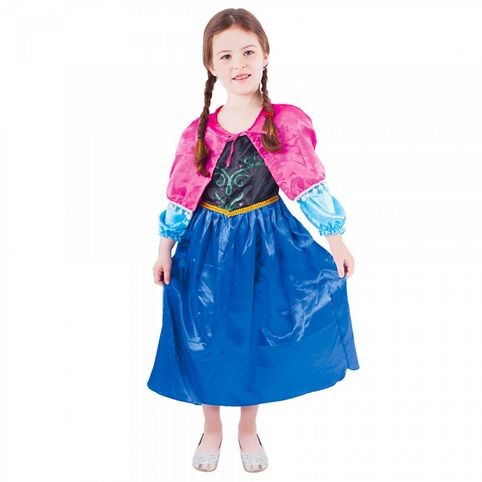 Překrásný dívčí kostým pro všechny sněhové princezny! Kostým ve velikosti S je určen pro holčičky ve věkovém rozmezí 4-6 let (100-116 cm). Velikost se může lišit od vyobrazení na obalu. Kostýmek je ušit v černo-modrých barvách, v horní částí je zdoben potiskem, zlatým lemováním kolem pasu. Součástí je také růžový plášť na mašličku.