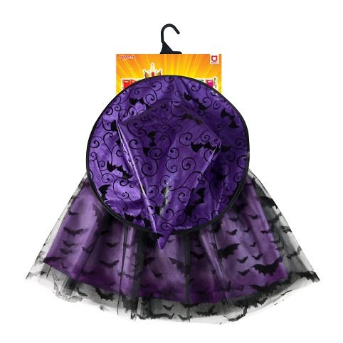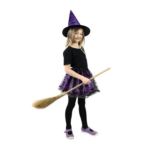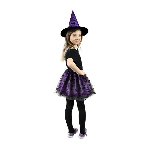 Magický kostýmek pro malé čarodějnice ve fialové barvě, zdobený černým potiskem netopýrů. Kostým je určen pro holčičky ve věkovém rozmezí 3-7 let. Balení obsahuje nadýchanou sukničku a k tomu perfektně sladěný klobouk. Délka sukýnky je cca 30 cm. Sukně je v pase na gumičku. Vhodný i na oslavu Halloweenu.