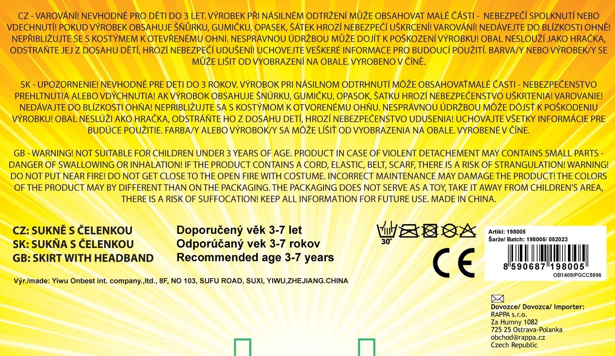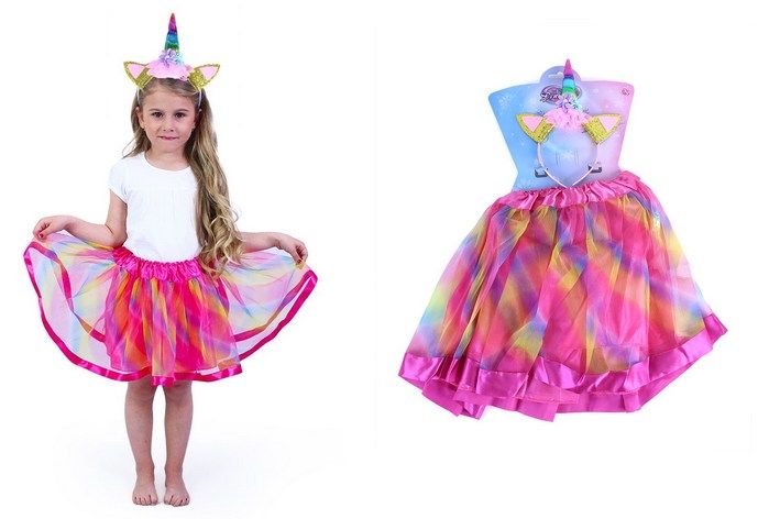 Tento úchvatný kousek v duhových barvách je zdoben saténovým lemováním. Součástí této sady je senzační čelenka jednorožce se zlatým rohem a barevnými růžemi!
