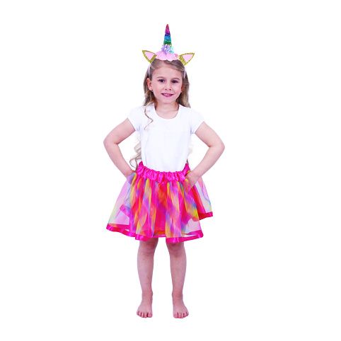 Roztomilá sukýnka TUTU je určena pro holčičky ve věkovém rozmezí 3-10 let (104-146 cm), obvod pasu 48-80 cm. Tento úchvatný kousek v duhových barvách je zdoben saténovým lemováním. Součástí této sady je senzační čelenka jednorožce se zlatým rohem a barevnými růžemi!