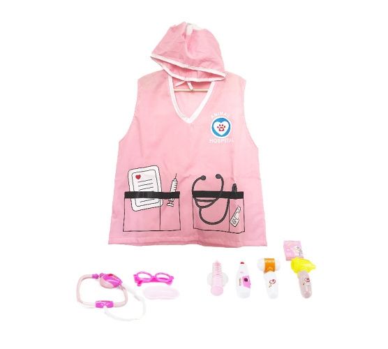 Kostým veterinářka s příslušenstvím. V této sadě najdeš vše, co správná veterinářka potřebuje. Stetoskop, otoskop, teploměr, to vše se světlem. Nesmí chybět ani injekční stříkačka, brýle, krabička s léky.